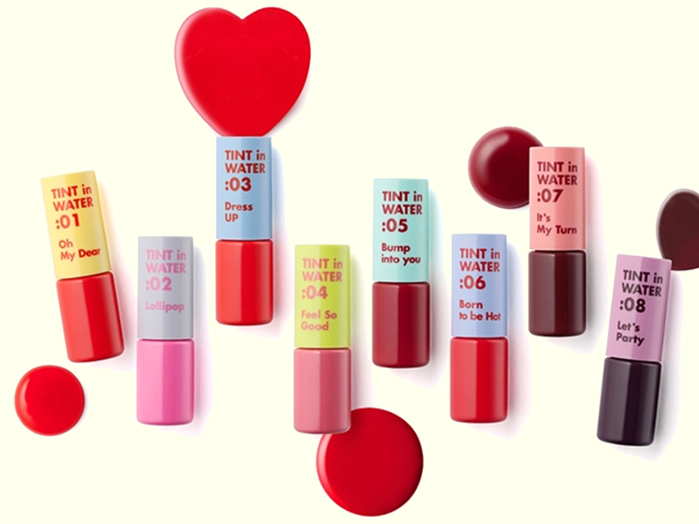 Tint in Water總共有8總顏色,只要輕輕塗抹一次就非常顯色,讓雙唇變得光滑沒有瑕疵!就算吃飯、喝水還是會有淡淡的顏色殘留,完全不用擔心出門唇膏完全不見!