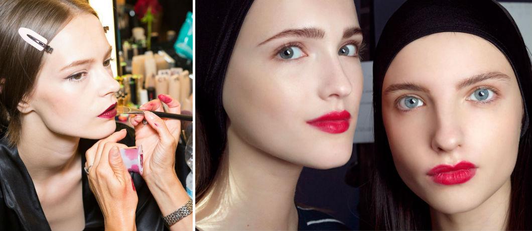 紅脣顏色的挑選上,以霧面帶有螢光的唇膏為主。運用粉底液或唇部打底的產品,將唇邊遮掉,從唇中間向外畫,唇周不要有唇線感維持自然的暈染,類似咬唇妝的畫法。