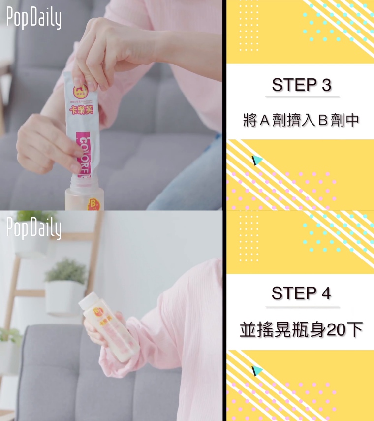染劑的部分,只要將A劑混合B劑後,輕輕搖晃約20下讓染劑均勻後,就可以開始染囉!真的有夠簡單吧!(別忘記要戴手套囉)