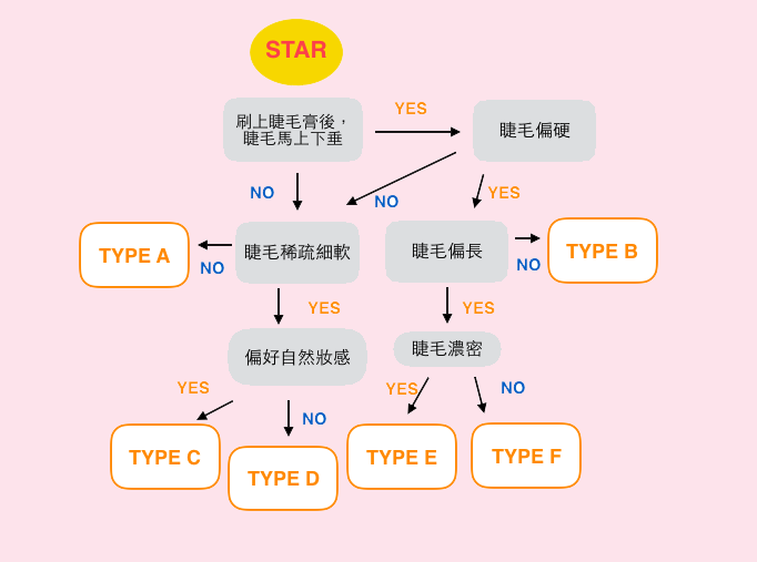 TYPE A因為睫毛本身有足夠的彈性,所以推薦Urban Decay trouble maker捲翹濃密一次擁有,持久力就算去趴踢一整晚也很夠力。若是走自然妝感或是日常妝的則是推薦Natrual republic long & curl mascara,纖細的刷頭刷眼頭眼尾超級方便唷~