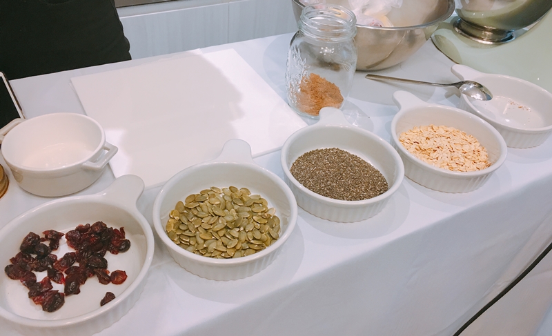 最主要材料是大燕麥片,其他可搭配堅果、果乾等等。像圖中示範的材料有黑糖、大燕麥片、奇亞籽、南瓜籽、蔓越莓果乾等等。
