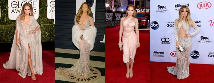 2012年安潔莉娜裘莉出席Academy Awards時以一襲側邊露腿黑禮服驚艷全場後,去年JLO出席Fashion Rocks時,不免東施效顰一下,選擇了Atelier Versace黑禮服,同樣露出了健壯的大腿線條,上半身一樣維持大露半球,開衩及腰,性感依舊。