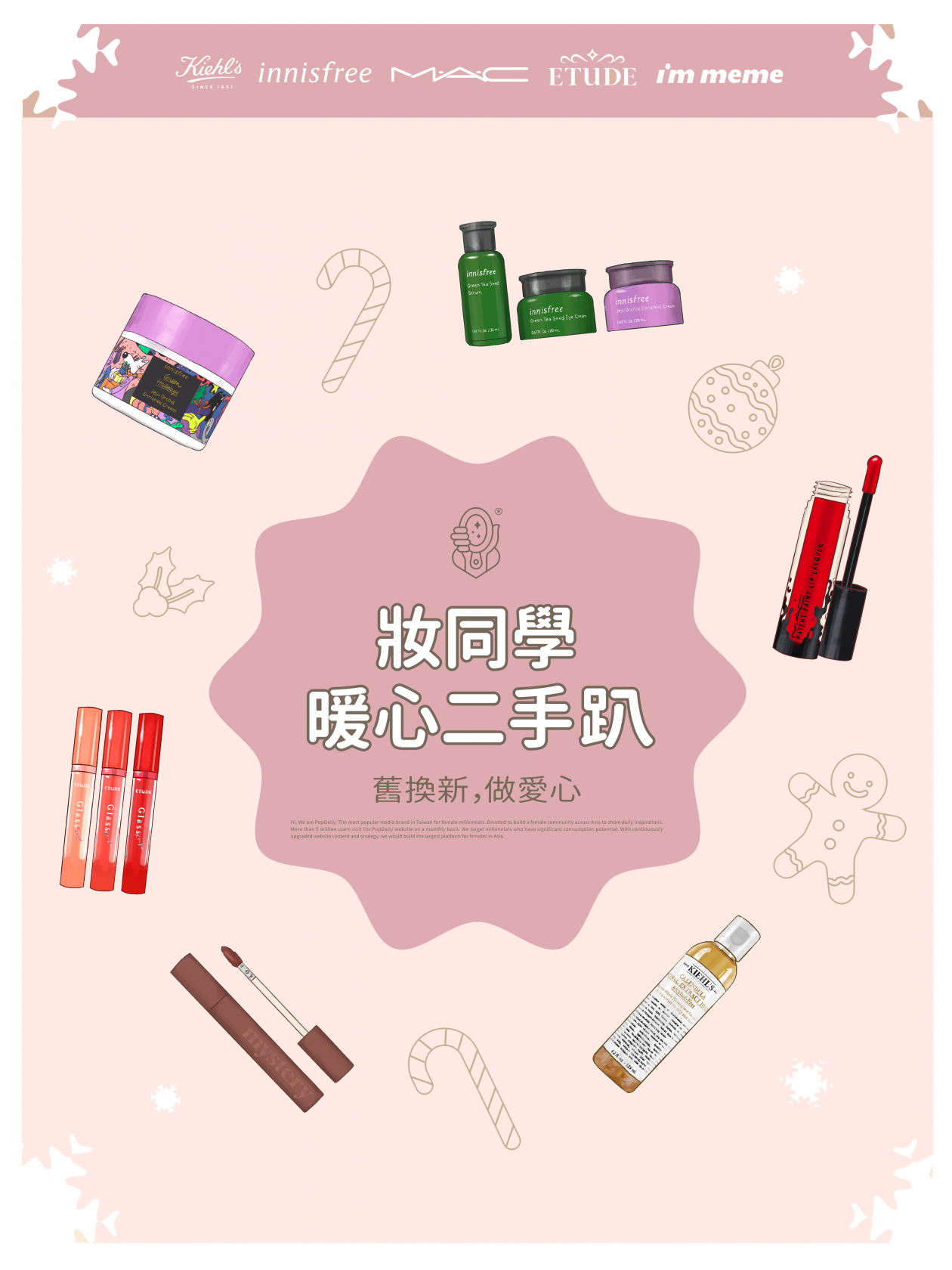 活動簡介:本次活動會抽出100位幸運兒與我們交換禮物,請寄來你們真心愛過但用不到的二手彩妝,收到的二手彩妝會全數捐給 公益團體-慈派,送給偏鄉地區的小孩~同時這100位幸運兒也會收到妝同學精選的聖誕好禮!