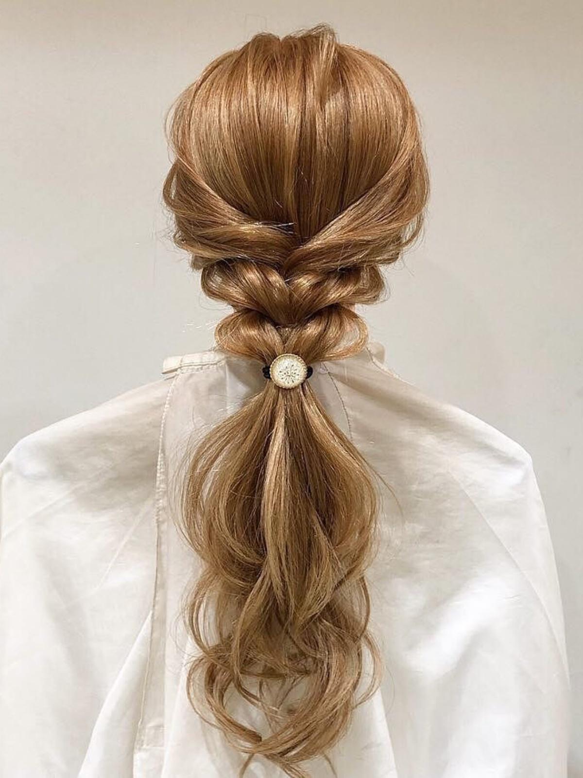 首先中間先綁個馬尾,兩邊的頭髮利用編髮,一邊編一邊收髮,尾端的部分兩邊綁一起,再和原本的馬尾整理再一起,一樣拉鬆就完成超簡單的造型。