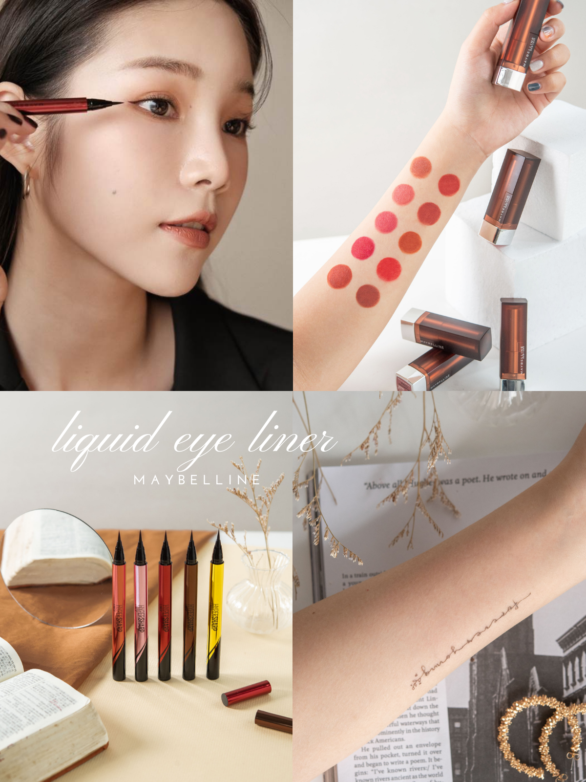 楓紅棕色眼線液配上開架唇膏霸主媚比琳「極綻色 絲絨霧光唇膏」時尚組合,絕對不會出錯。小編精挑10色主打色、土色、裸色通通有,擦上它不會搶過眼妝的風采,反而更加分,同時平衡整體妝容。