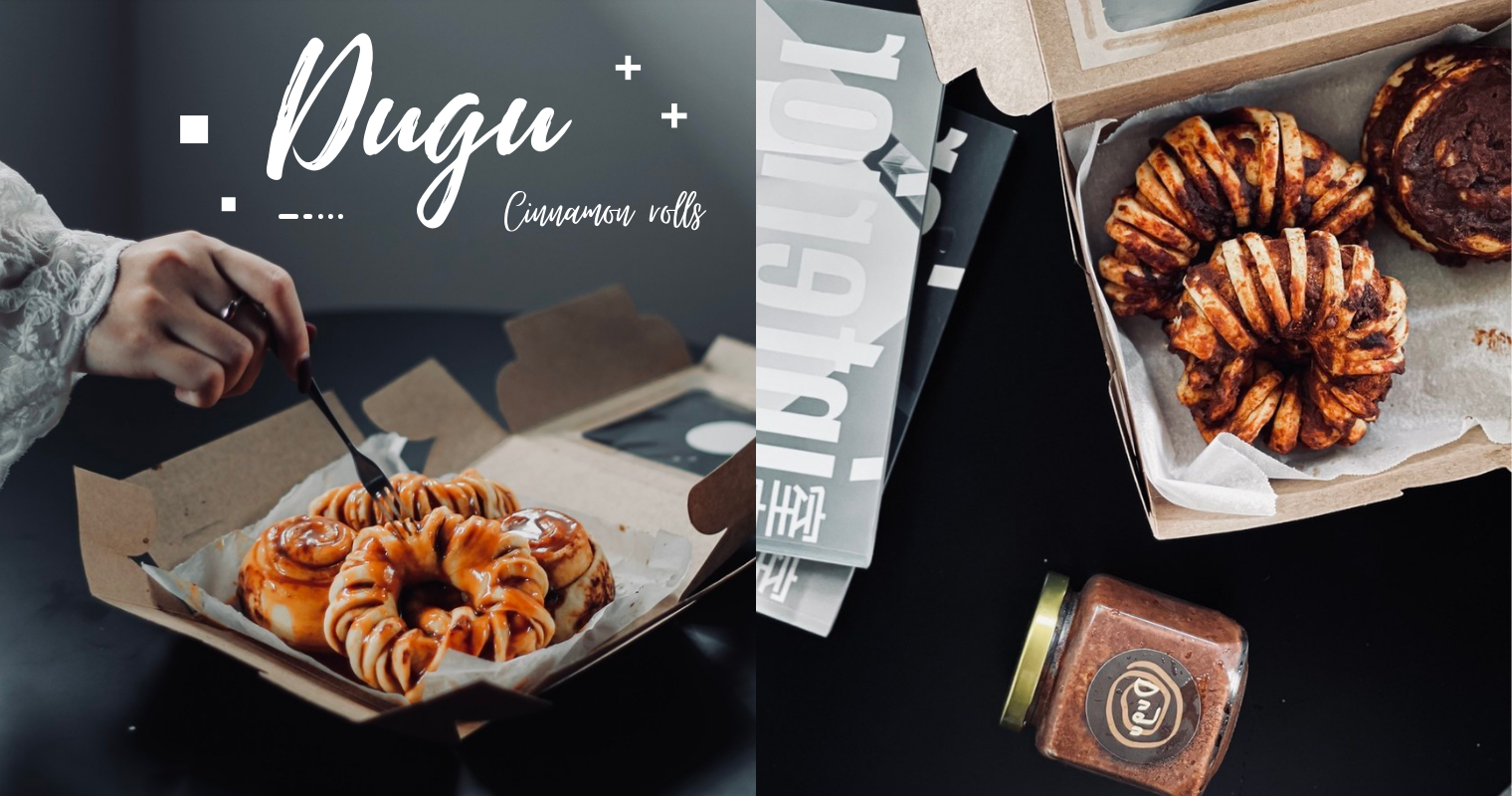 近兩年的熱搜甜點絕對非肉桂捲莫屬!可以看到各個咖啡廳、甜點店都賣起肉桂捲,而專門販售肉桂捲的網路甜點工作室也紛紛興起,而其中有一家超低調、名字超可愛的網路肉桂捲專賣店「Dugu肚咕 肉桂捲製造所」,其特色是前所未有的「車輪濕捲」及「麻花乾捲」,造型及口感都有別於其他店家,搭配店家堅持自行研發的手炒顆粒黑糖肉桂醬,甜而不膩~每次開單都是上百單,在路邊等待面交的人可是大排長龍呀!