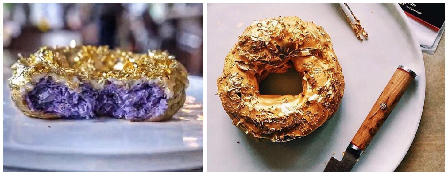 一個要價3300台幣的甜甜圈你吃過嗎?美國紐約布魯克林的菲律賓餐廳甜點師德拉克魯茲,想出用故鄉普遍的紫色蕃薯當甜甜圈主要材料,覆上加了水晶香檳的濃郁糖霜,糖霜選用高級的路易侯德爾水晶香檳,一瓶都要上萬元台幣,而內餡則是獨家的招牌幕斯與香檳果凍,外層灑上24K金箔,點綴金箔是最花時間的步驟,讓整個甜甜圈成為當場餐桌上的唯一焦點。
