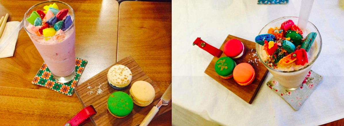 小編一直在看那一杯一杯色彩繽紛的飲料到底是什麼,結果終於被我破解了,他們竟然把馬卡龍切成小塊小塊放在飲料裡面。天啊!也太可愛了吧!