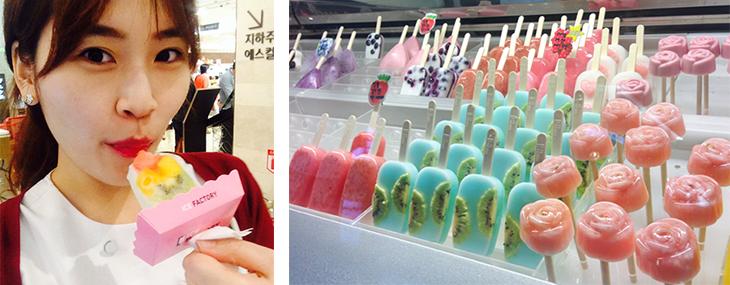 光看到櫃子裡擺設出來的冰棒五顏六色的心情就莫名好起來,它們為了不讓客人冰棒融化會弄髒手,連握柄的紙都是精心設計過耶,這樣感覺就是在為全國女生設計出來的啊!這在韓國百貨公司地下街就有了,有興趣的女孩們一定要去試試看喔!