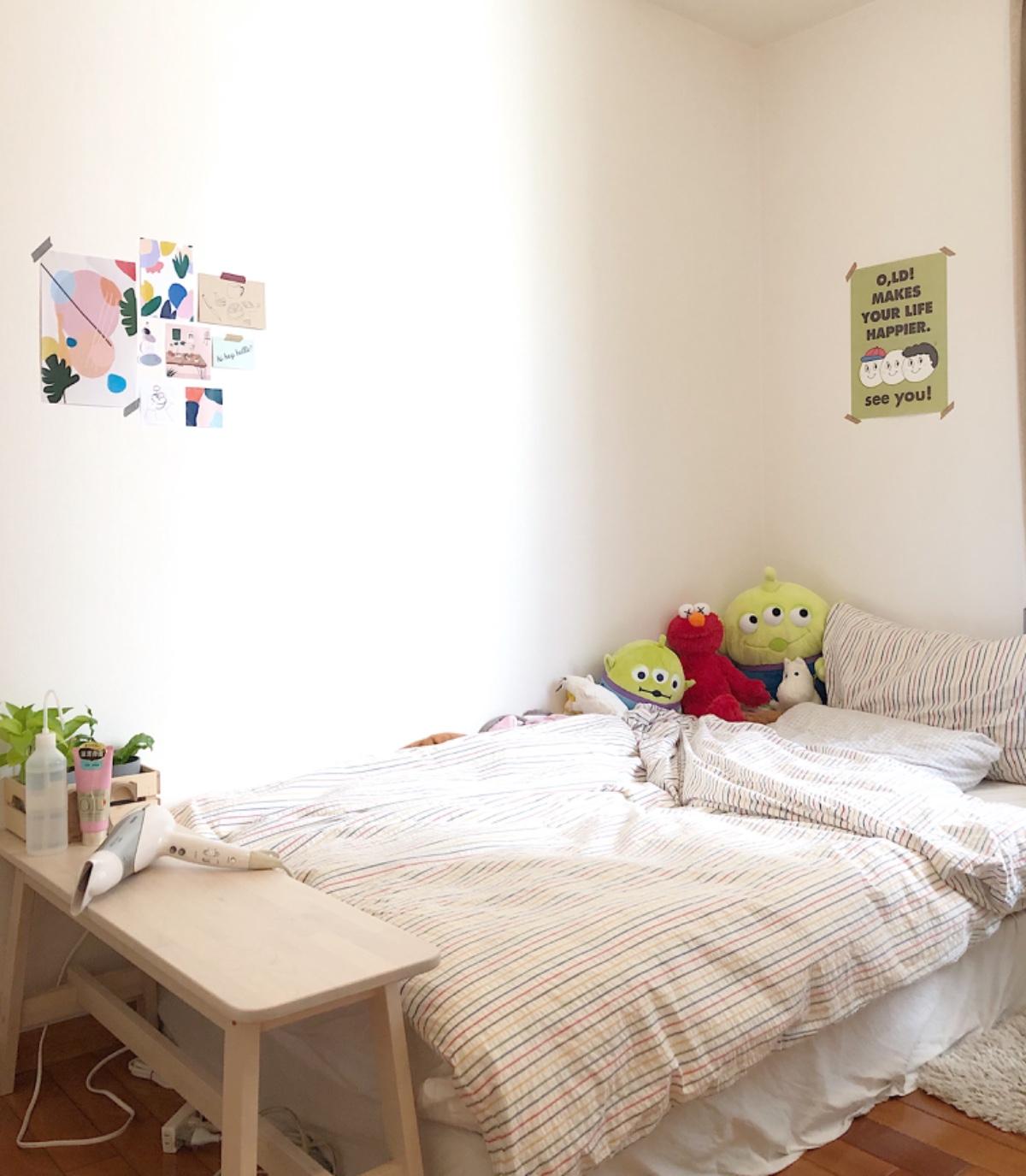 床前面養了兩個小植物活的非常好😂牆壁上貼了一些自己喜歡的小圖片跟海報💗