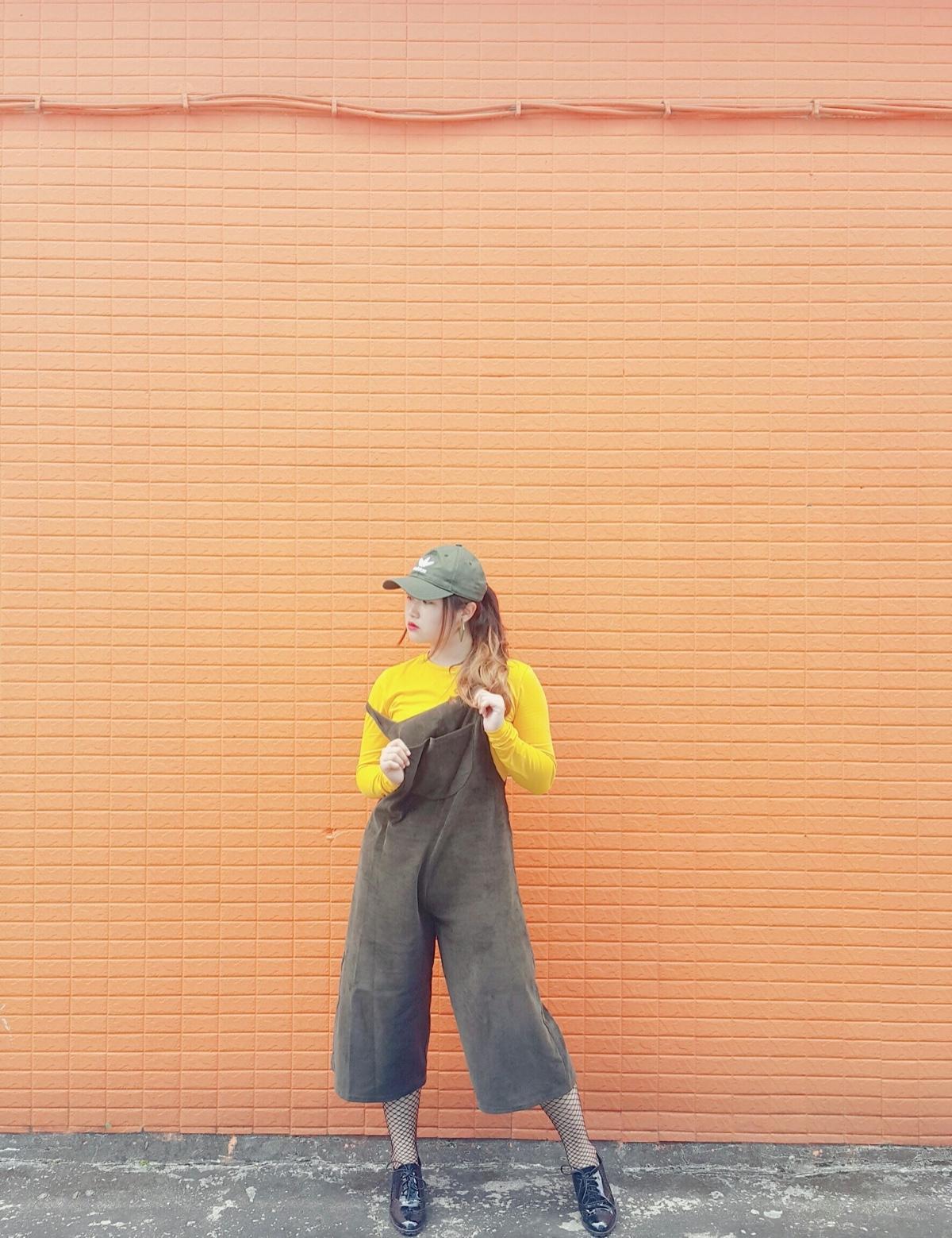 前幾次的墨綠吊帶褲,配上黃色的打底衣,也是很好看❤️ (網襪有修腿的效果呢☺️