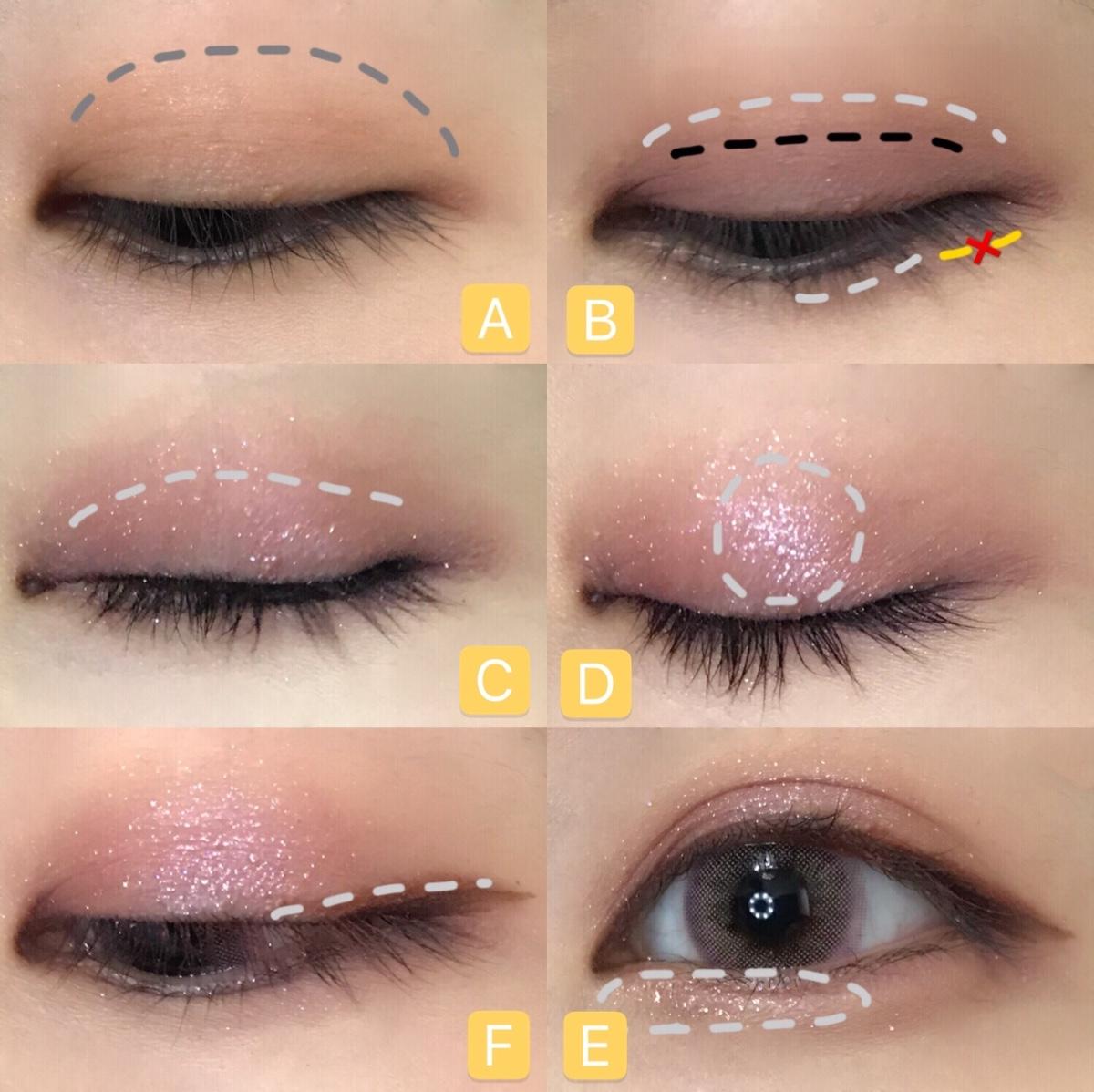 Step B🧡 將紫色眼影刷滿灰色虛線內,記得眼睛張開後看的到眼影即可,以雙眼皮線(黑白虛線)為基準。 下眼影塗在眼球正下方,不要跟眼尾連接。