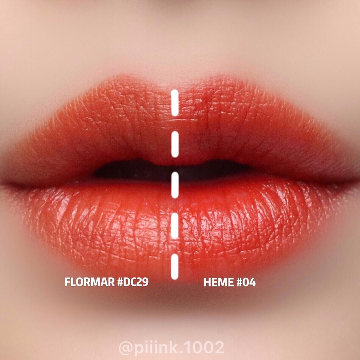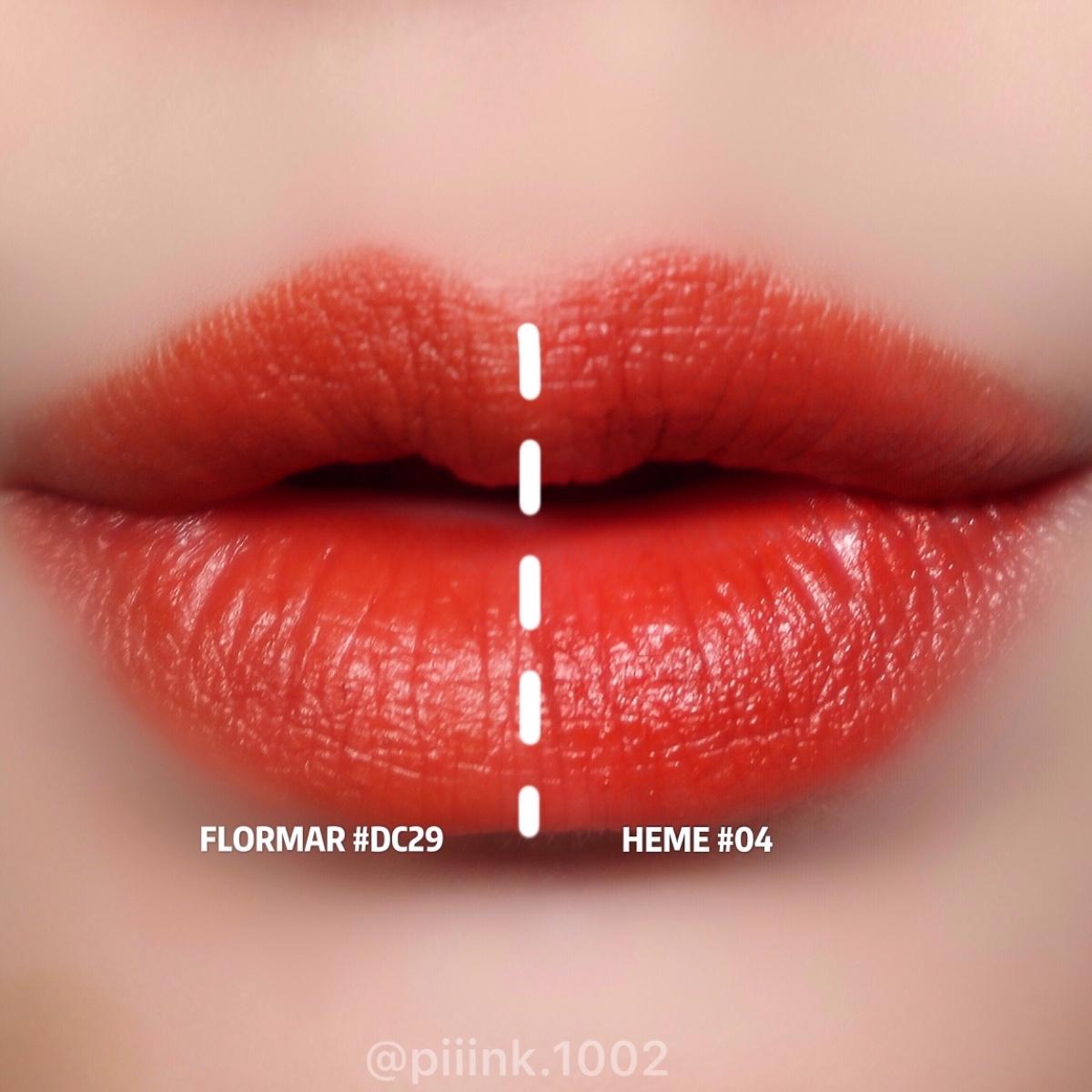 FLORMAR # DC29 v.s HEME # 04 1 / 2又是一個可能分不清的比較圖,眼睛比較利的應該可以看得出來heme更紅一點吧😂,總之給最近有被這兩隻燒到的朋友參考(⁎⁍̴̛ᴗ⁍̴̛⁎)⠀⠀(圖2)是自然光#piiink比較圖 piiink.1002💋 素唇偏白不太乾 試色僅供參考💄