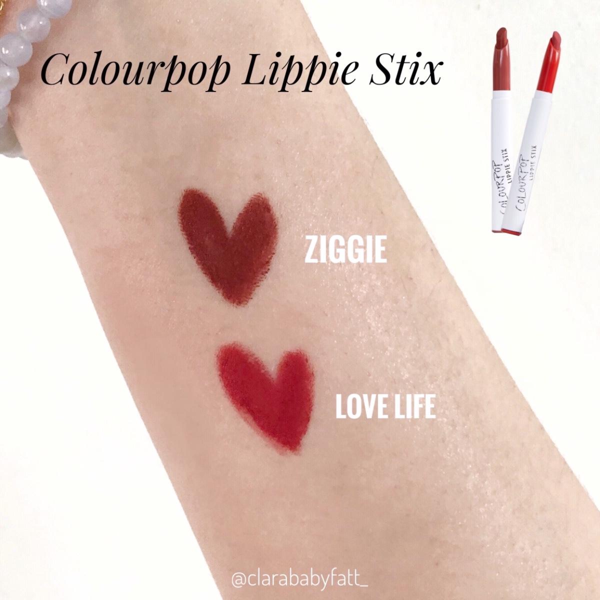 Colourpop Lippis Stix 兩隻熱門色 都是完全Matte質地的 我覺得有點乾,一定要先上護唇膏打底 不滑順,就是在塗的時候會稍微拉扯唇部的那種不滑順 非常非常飽和,微轉印、微沾杯 持久度是很不錯的👍 我自己使用方式是在護唇膏之後,用點的方式,再手指暈開 薄擦就很好看了 #Ziggie 我覺得土星人會喜歡 顏色是暖調土色 厚擦會有暗黑系的感覺 #LoveLife 暖調砖紅色 薄擦很鮮豔;厚擦會棕色会很明显 稱膚色,顯牙白 上次Jennie仿妝也用了這隻
