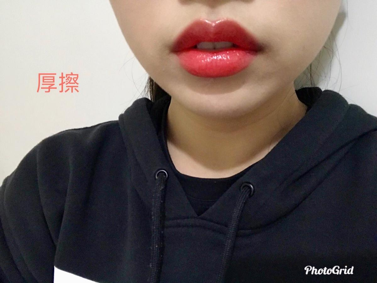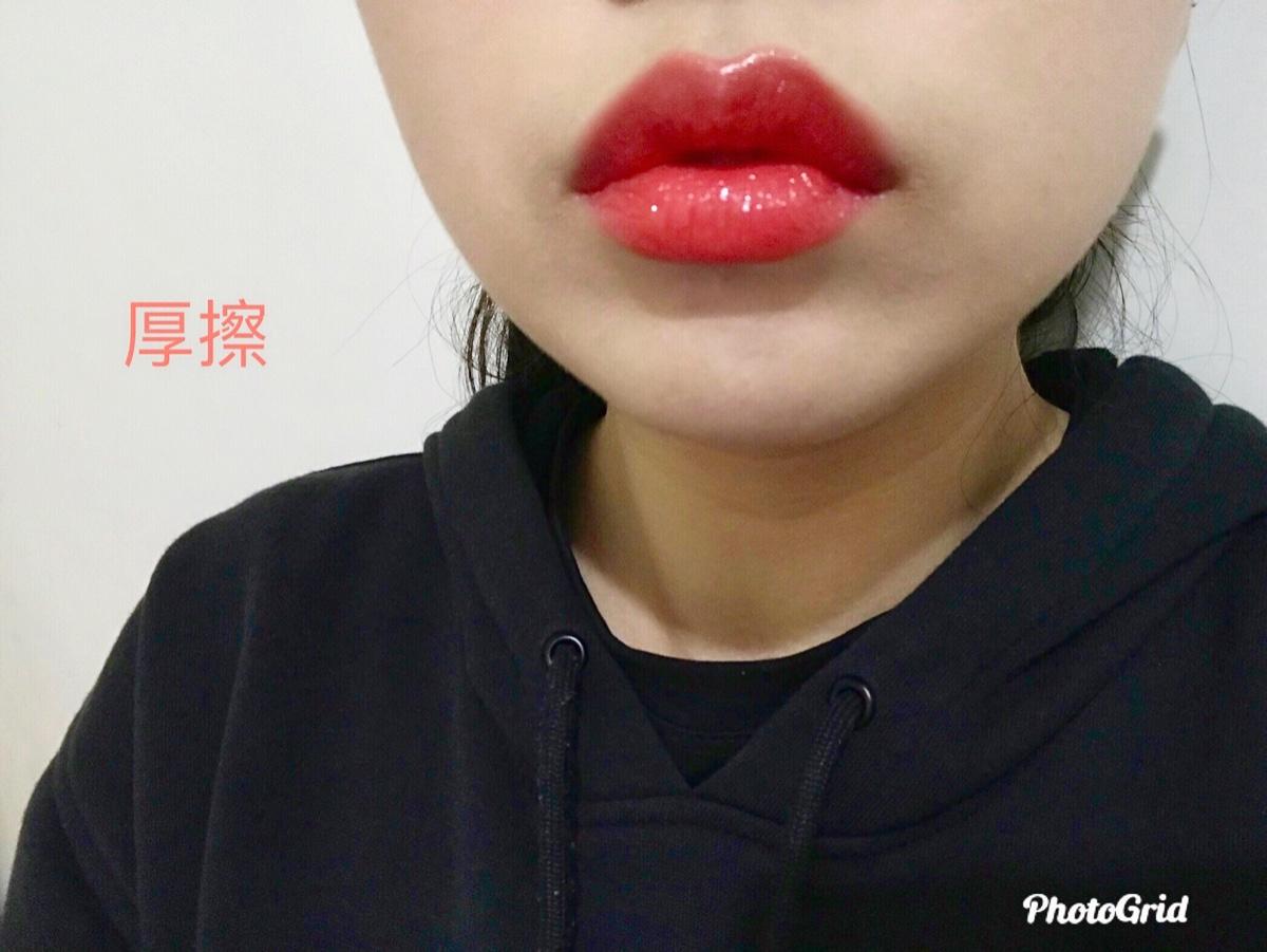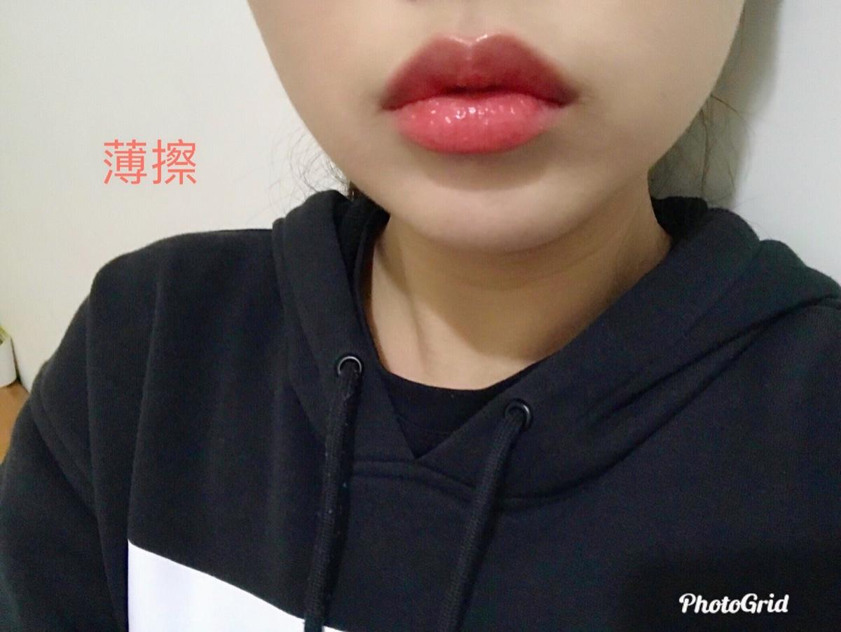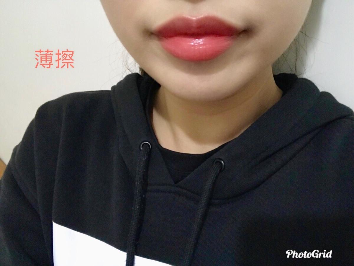 千萬不要小看它 是光澤保濕款,就覺得很容易掉色❌ 薄擦和厚擦的對比非常大!薄擦時,淡淡的橘粉色,卻非常顯氣色🌝 多擦個兩三層,顏色就會很飽和很美!吃完飯的時候顏色不會全掉光,會像薄擦那樣淡淡的~