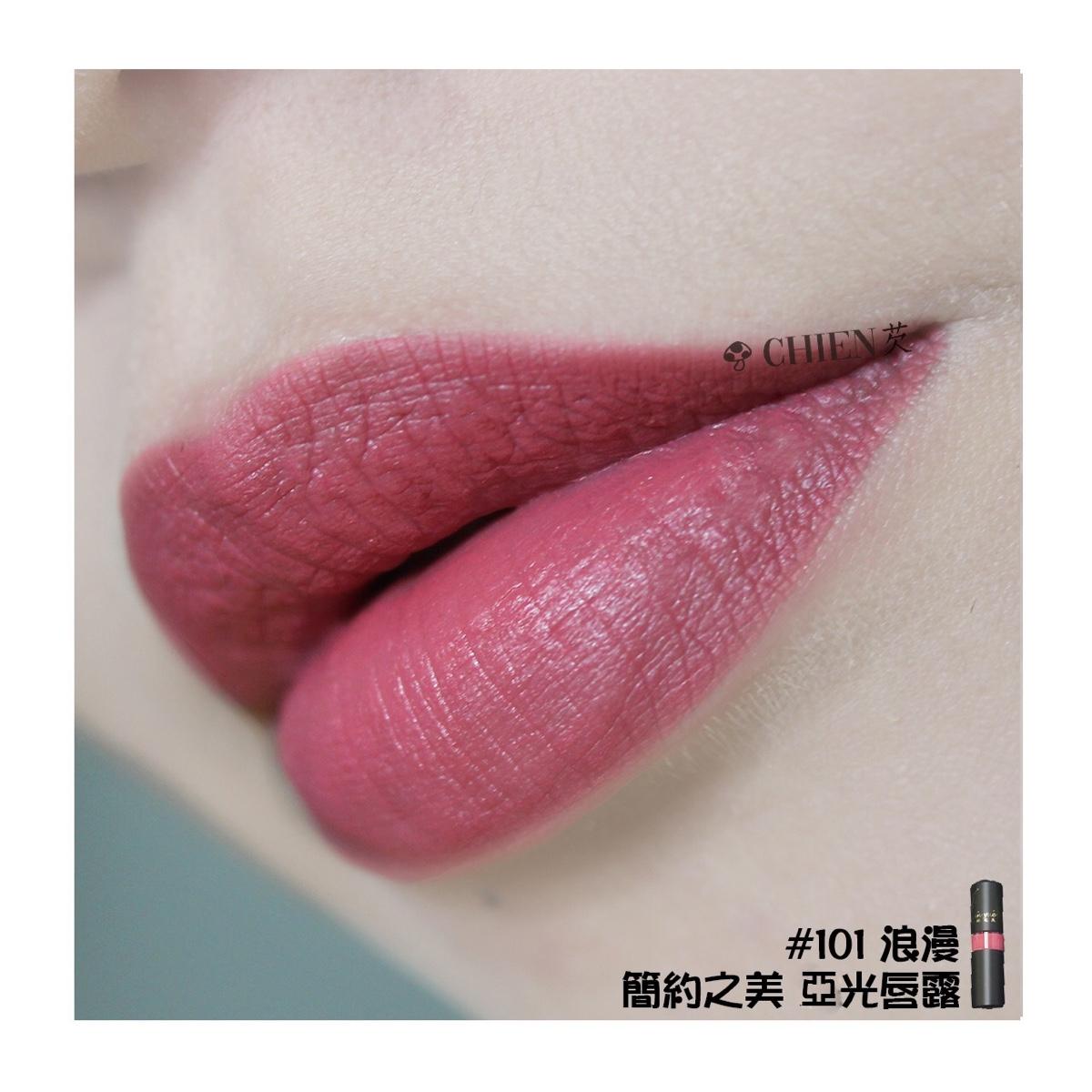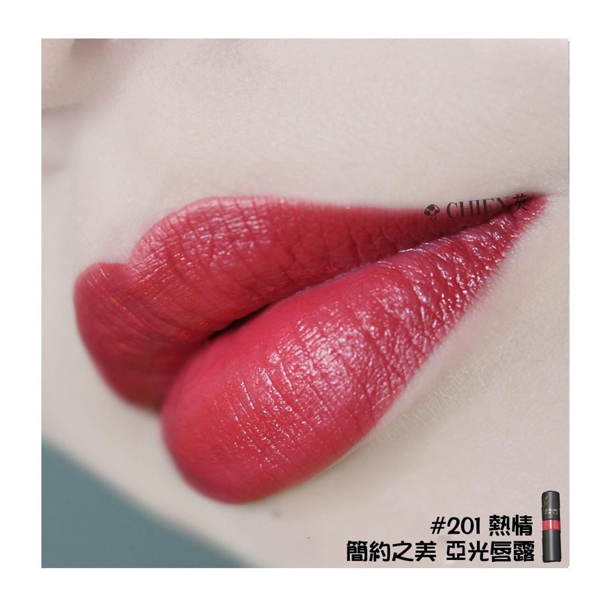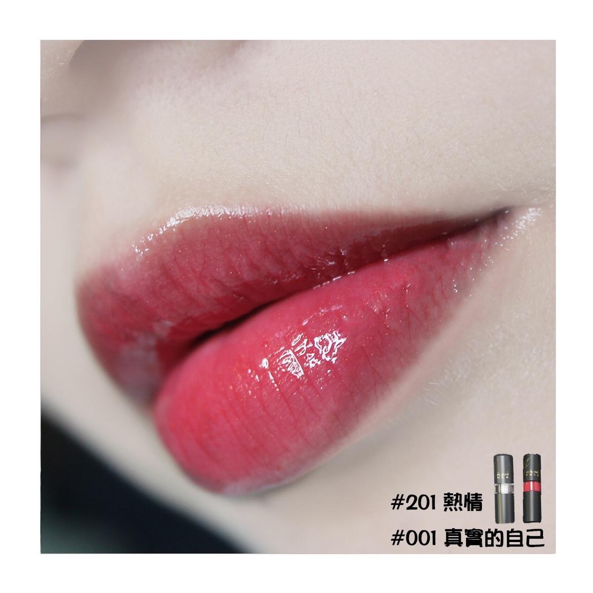 🍄這邊單獨介紹透明款#001跟#201 熱情的疊擦搭配,這款霧面唇露質地偏水,乾的速度相對較慢,所以也比較好推開,不會擦到一半就斑駁的窘境出現,而簡約之美也很貼心的出了一款可以緩解唇釉、唇萃、唇露黏膩感的透明唇油💯