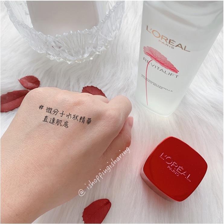霧面磨砂玻璃瓶上除了有一枝帶透明感的紅色積雪草,還有燙金的 L’Oreal,其餘的產品內容則用消光的黑字來清楚呈現😳😳😳