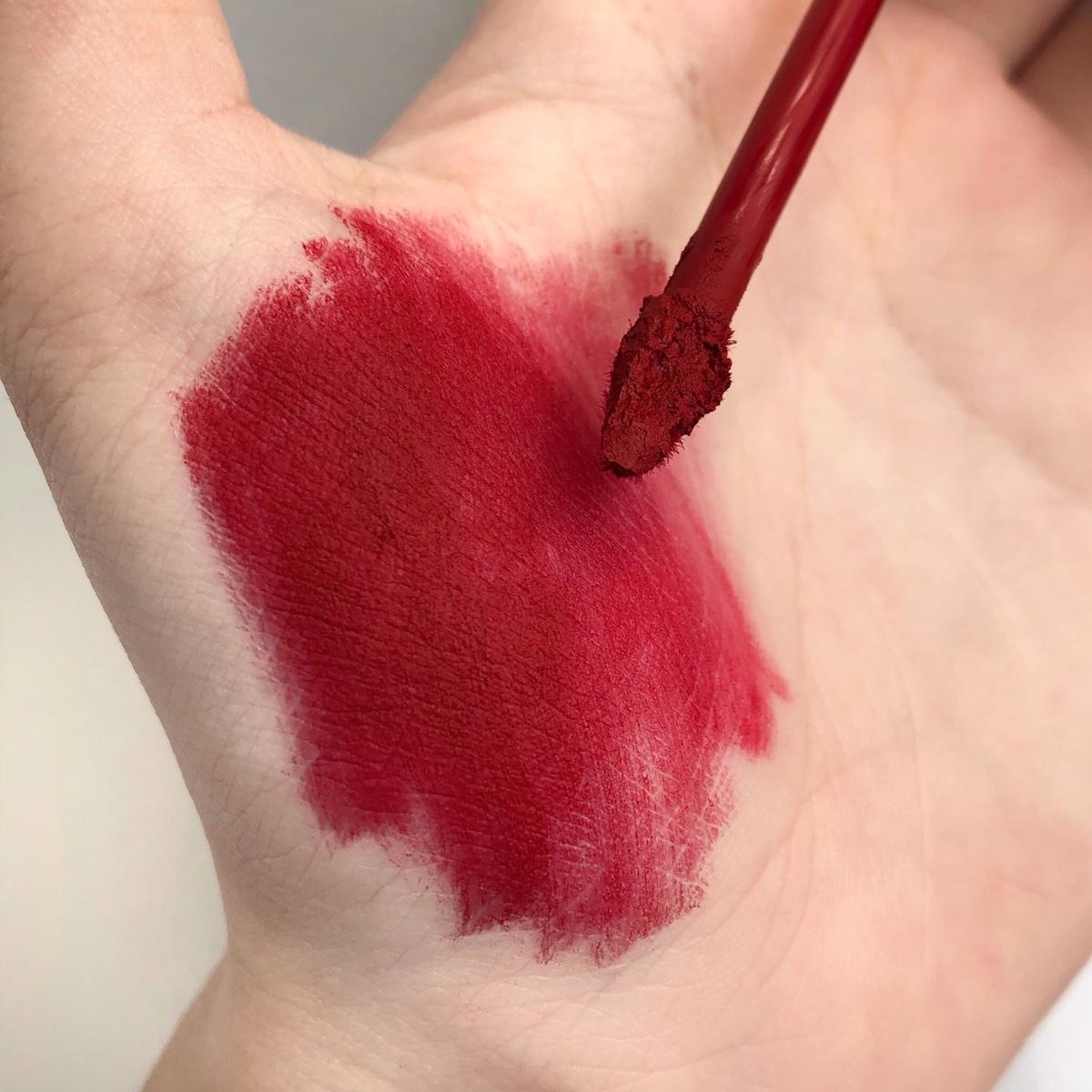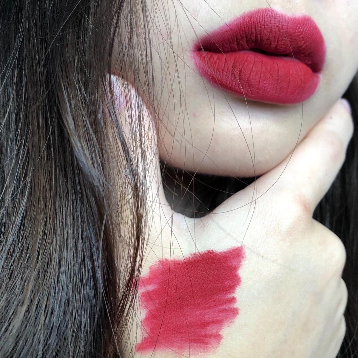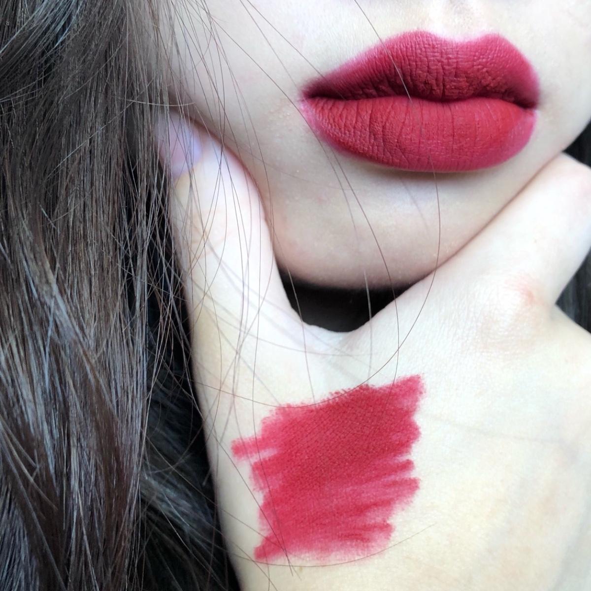 說實在這個顏色真的很美一個帶冷色調的復古紅,飽和度非常高,塗一點點抹開就很足了,霧面質地,但刷頭拔出來上面的膏體有點結塊的粉感,但上嘴不會到很乾,稍微染唇