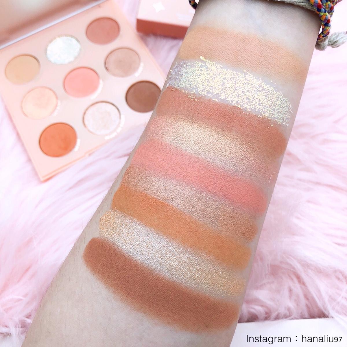 這盤配色乍看之下和sweet talk很像,但實際刷色完全不一樣,這盤更偏粉,centerfold這顆偏螢光粉橘超美,霧面色很好暈染,深色疊加起來也很好暈開,不會有sweet talk結塊不好暈染的問題,這盤也有大亮片,但這顆眼皮敏感的人,要避開眼周使用,整盤配色有深有淺,可以淡妝也可以很歐美,今天先和大家分享比較日常的眼妝,下次再來分享浮誇的眼妝給大家~要記得來看唷🍑