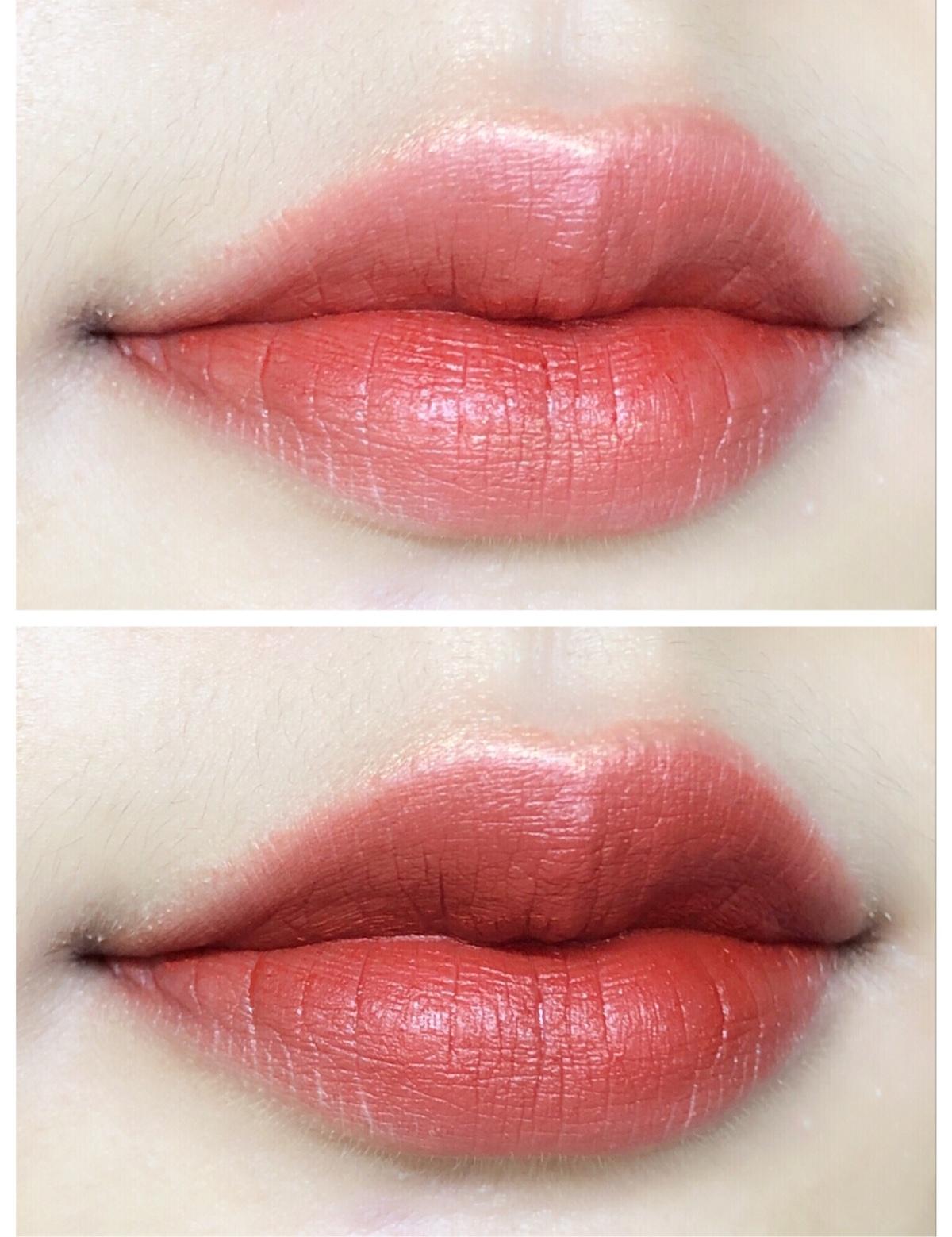 正好手上的Missha MRD02用完了,看到EH這一款還蠻心動的就買了~上唇的顏色比圖一要再紅一點,肉眼看的顏色比較像圖二。 薄擦是一個上班上課可以擦的日常色,約會出去玩時就可以厚擦~ #試色分享