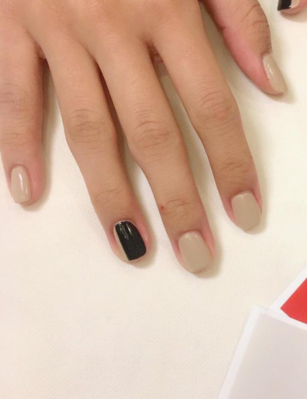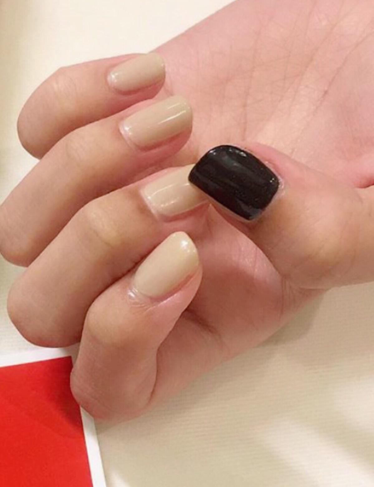 有時對光療沒什麼特別的想法,就會以棕色、裸色、酒紅色系的顏色做備案,今天以裸色系的奶茶色為基底,在大拇指及無名指部分加上黑色的方塊做變化,想要不經意的讓人發現自己的小巧思,也意外發現這次配色很像珍珠奶茶呢。