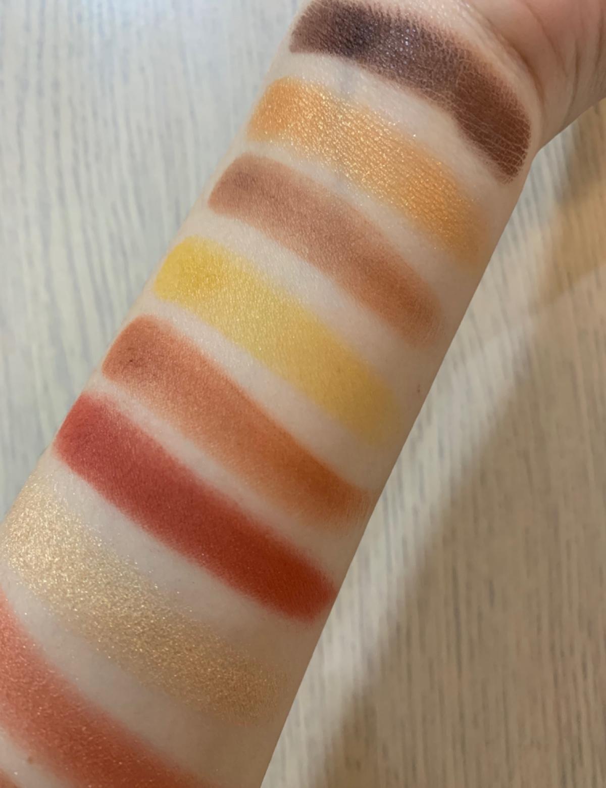 這盤的顏色既俏皮又可日常,一盤眼影有黃、橘、紅三種色系可以畫,也有打底色跟眼線色,真的很萬用!