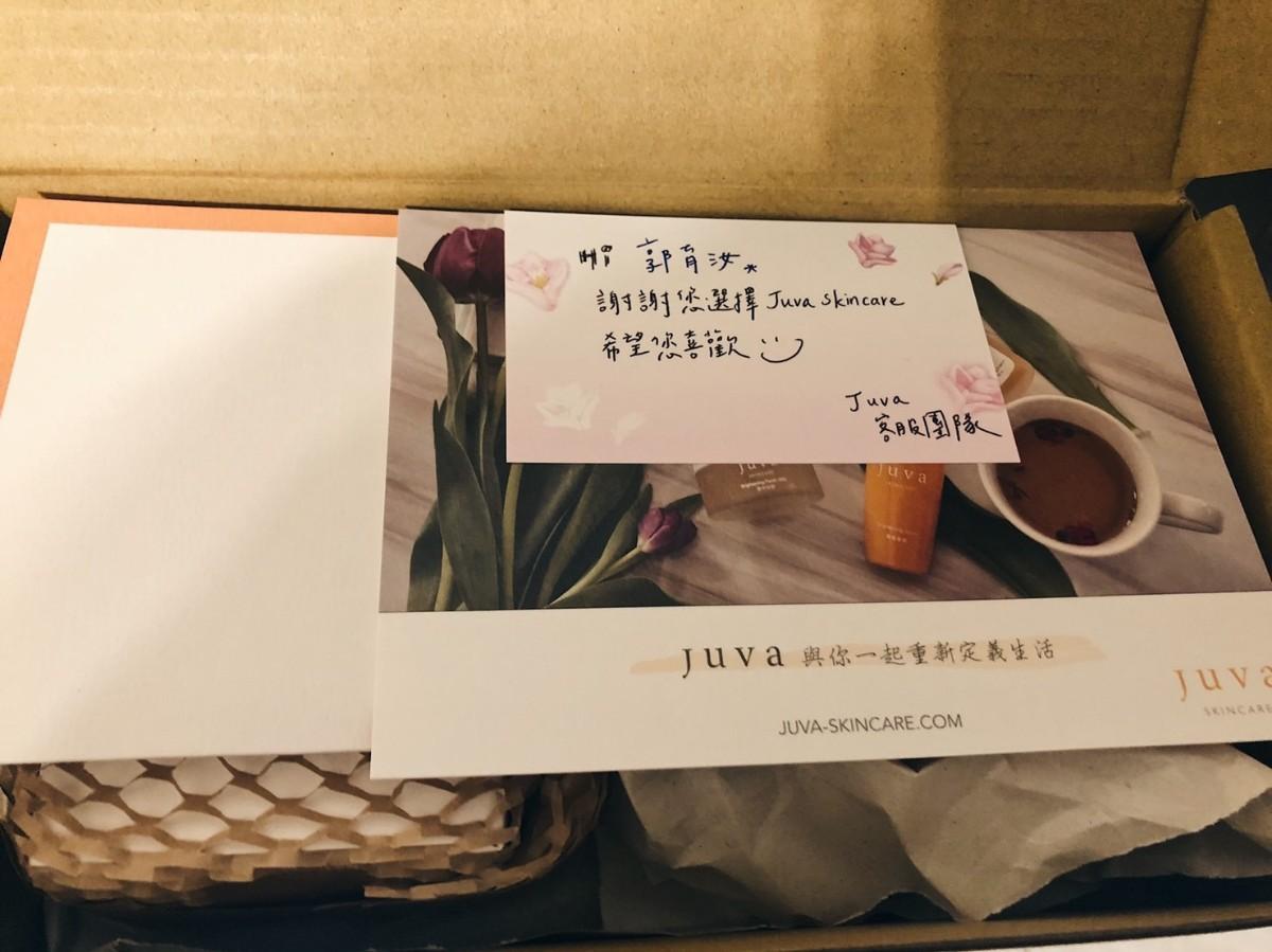 一收到JUVA送來的包裹真的覺得很貼心,裡面還附有一張小卡片💗