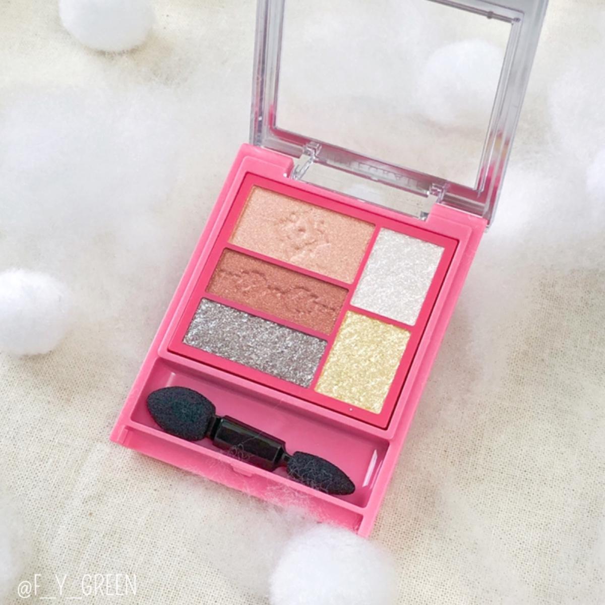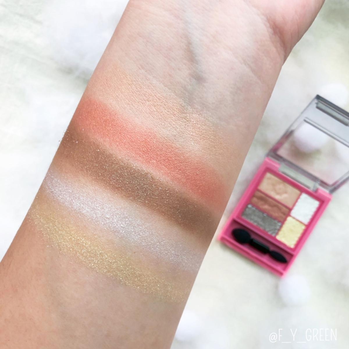 一樣有精緻的剪影圖案,內共有5個顏色且都是珠光和亮片,粉質是細緻絲滑的、顯色度以日系品牌來說很不錯、大亮片雖然看起來顆粒大⋯摸起來卻不粗糙。唯獨疑惑的是最下面看起來是灰色的那顆⋯刷色起來比較偏咖啡色調,不過也不難看,是一個比較暖色調的組合。