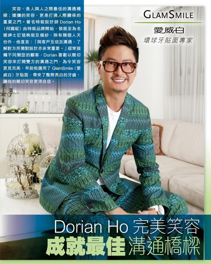 笑容,是人與人之間最佳的溝通橋樑:燦爛的笑容,更是打通人際關係的重要之門。著名時裝設計師Dorian Ho(何國鉦)由時裝品牌開始,發展至為名媛紳士訂造晚裝及婚紗,除有賴個人天份外,他直言:「與客戶互信及溝通,了解對方所需對設計亦非常重要。」經常接觸不同類型的顧客, Dorian喜歡以親切笑容來打開雙方的溝通之門,為令笑容更見完美,早前他選用了Glamsmile (愛威白)牙齒貼片,帶來了整齊亮白的牙齒,讓他的親切笑容更添自信。