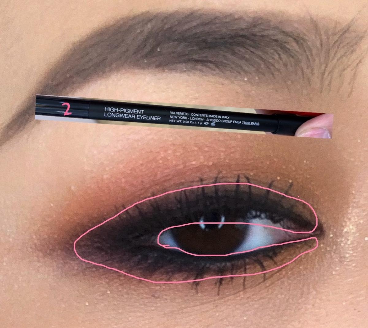 難道你想畫一個無神的眼睛嗎?!再來把上下的外眼線大ㄑ位子 狠狠的畫出粗粗的眼線 再拿一隻略紮實的#44刷子 把眼線暈染開)
