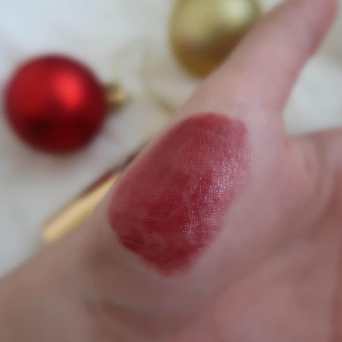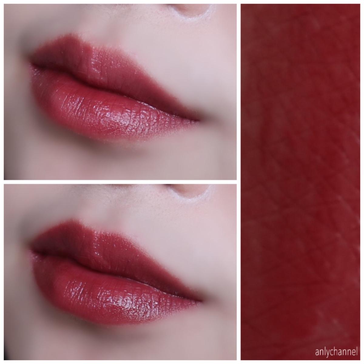 他是算偏暗的玫瑰色,是稍微帶紫的棕紅色,但是因為妝感是亮面光澤型的,讓他顏色不會太沉重,是很美的水紅玫瑰,厚擦薄擦沒什麼區別啦比較是透透的妝感