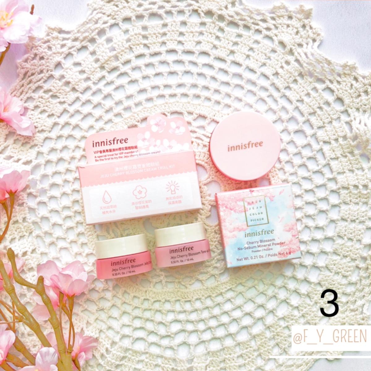 innisfree的濟州櫻花雙體驗組,內有一罐10ml的亮顏霜和10ml的水凝霜。另外一個產品是無油無慮控油蜜粉-櫻花限定版,特別的是還帶有櫻花的香氣喔。