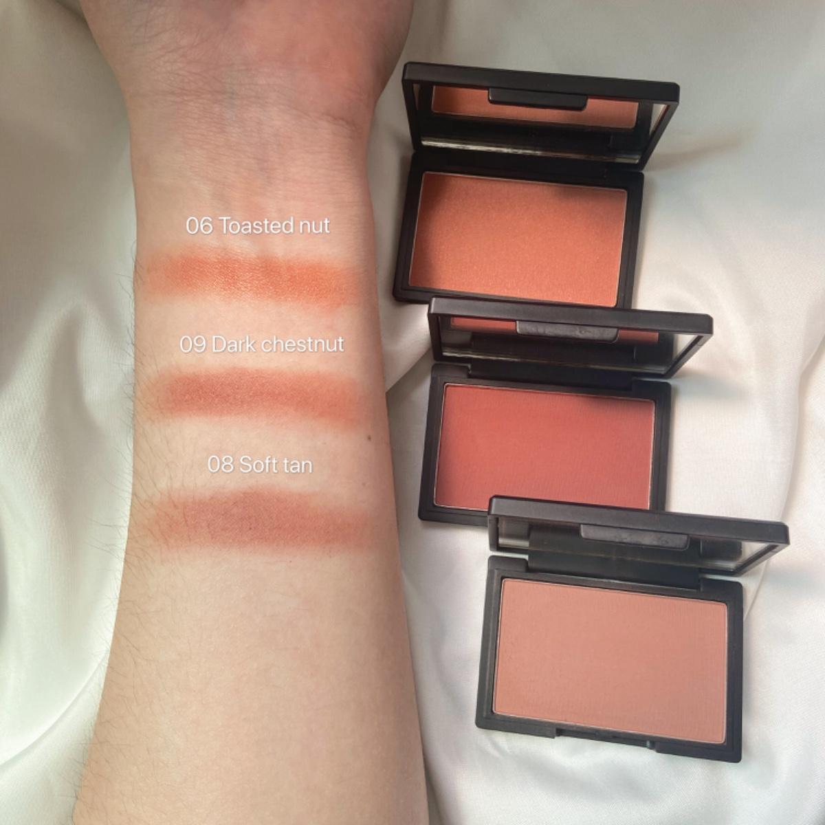 帶有金色與粉色珠光的土橘色,適合白皙膚色到健康膚色的人使用,我覺得這顆腮紅是非常適合夏天,上臉之後會有一層非常細緻的光澤,會給人一種很有活力很健康很可愛的土橘色,而且不太會顯肌膚紋理~⠀
