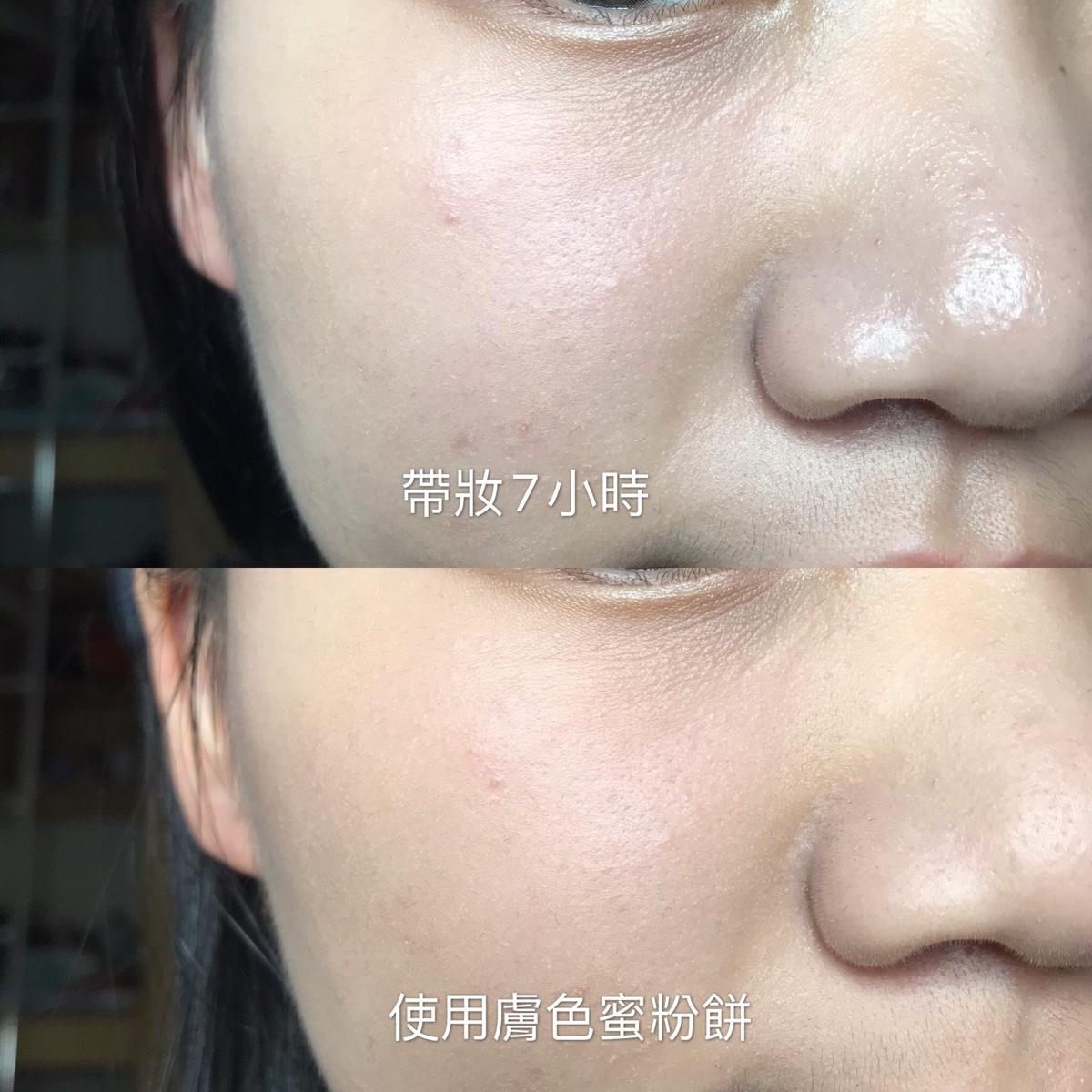 我是用膚色粉餅來補妝、可能帶妝5小時後用粉餅上臉、會讓有點掉妝的臉重新變得、平滑、霧面、遮瑕效果也有
