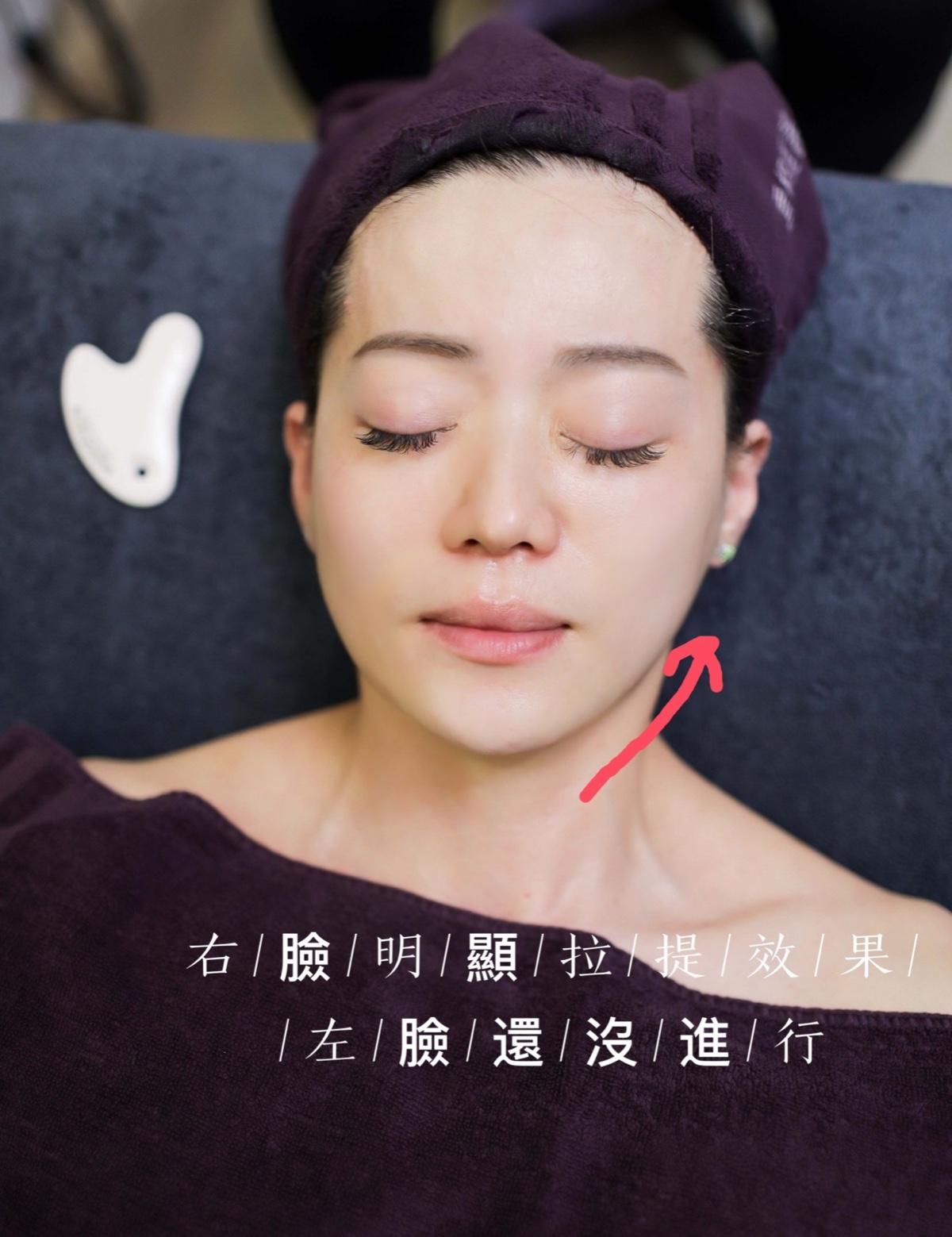 👉這次來體驗臉部的「冰肌緊顏塑臉課程」第一步驟先進行頭部深層抗壓手技鬆筋按摩,再來最特別的地方是用北投石做成的刮板來刮頭部,甚麼是北投石?它是大自然中少數能夠釋放天然負離子的礦物質,並含有微量的放射性元素—鐳。天然負離子對人體是有好處的,第二步驟美容師搭配獨家產品藍酮冰肌素先在右邊臉部塗上一層,再用北投石沿著臉部線條、肌理來刮臉,讓冰肌素快速吸收,不但可促進臉部血液循環,讓臉部也有拉提的效果,來看看左右邊臉真的有明顯差異,整個臉刮完成之後,第三步驟敷上保濕面膜再用儀器導入加強皮膚吸收,一般店家都只有敷面膜這個步驟,這裡使用儀器再加強導入真的好讚,體驗完整個臉部療程,真的素顏也能有自然紅潤肌,重點是臉部拉提效果好明顯。