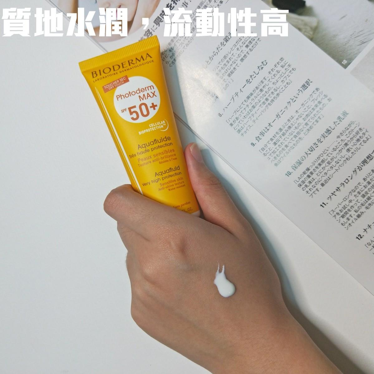 質地是水潤且偏乳液狀的質地,流動性高。很好延展,容易均勻塗抹在想要防曬的部位!