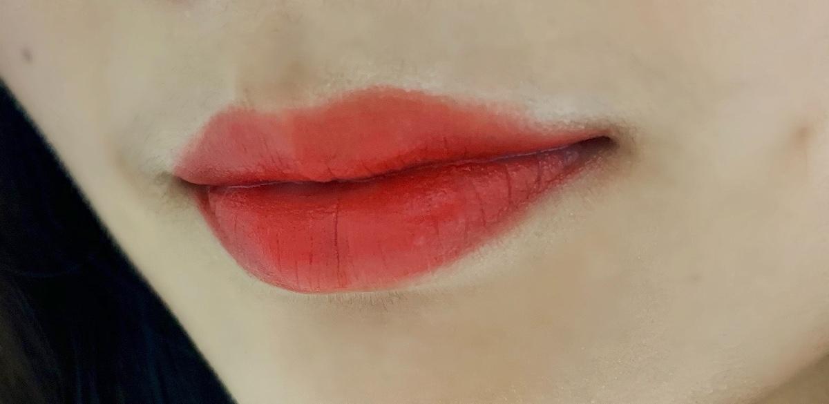 顏色很飽滿,有一種午後暖陽的感覺,附著力很強雖然是霧面但是不會感覺嘴唇乾,個人覺得有點小難塗勻,今天我分兩次上就比較好一點,這支吃完飯會有一點餘色