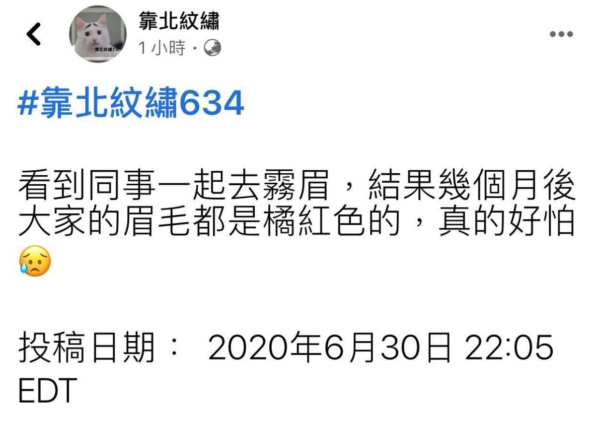 看到同事一起去霧眉,結果幾個月後大家的眉毛都是橘紅色的,真的好怕😥