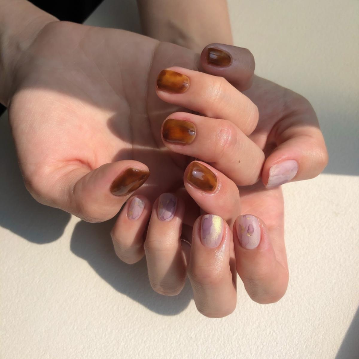 溫度感受不到秋天,那就用裝扮感受吧☺️ 超喜歡這次做的光療!這間店的是走復古華麗風格,那時看到琥珀就決定一定要有一手呀🧡 楓糖琥珀&冷色調藕紫灰水彩金沙,愛到不行呀🥺 #美甲 #光療 #凝膠美甲 #日系美甲 #琥珀 #水彩 #冷色調 #莫蘭迪色 #復古 #油畫 #秋 #2020 #波波黛莉 #波波妝漂亮 #nails #gelnails #nailart #amber #painting #cold #morandi #vintage #autumn #popdaily #popbeauty #popstyle #Q比的生活點滴