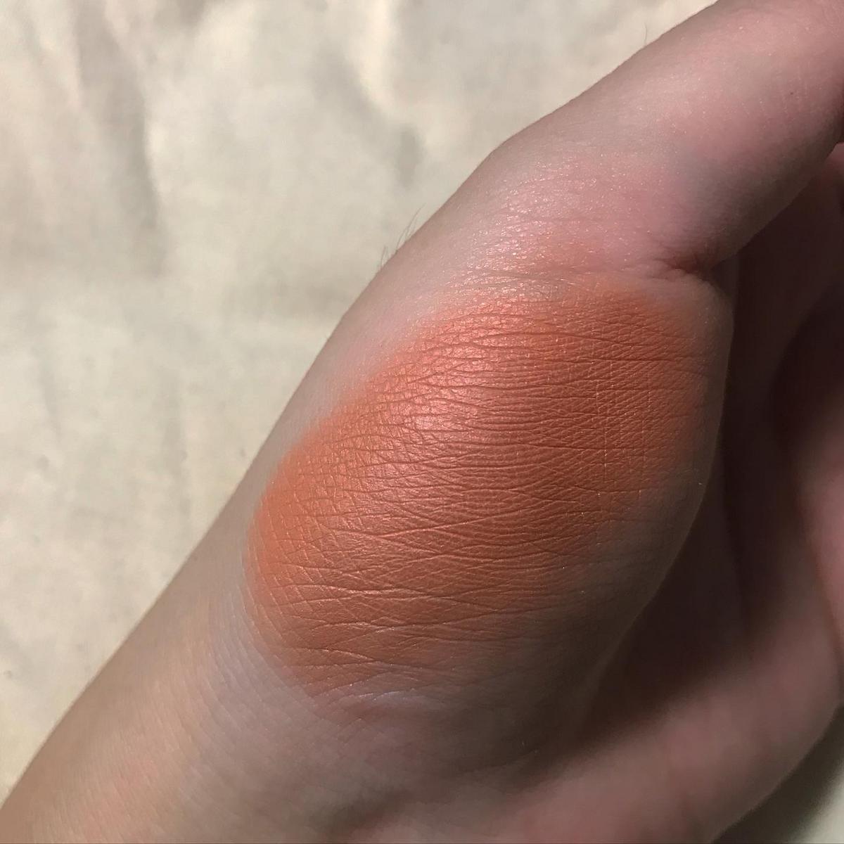 如品名Orange,這顆單色眼影抹出來的色調會比盤中更橘(盤中所見是帶橘調的咖啡色)