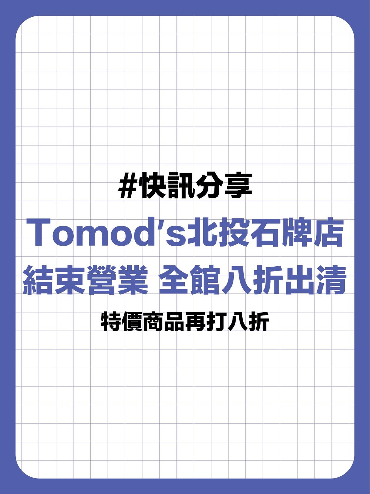 快訊分享!Tomod's北投石牌店結束營業大出清!全館八折!