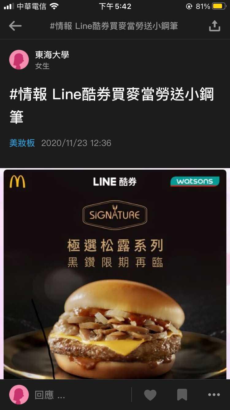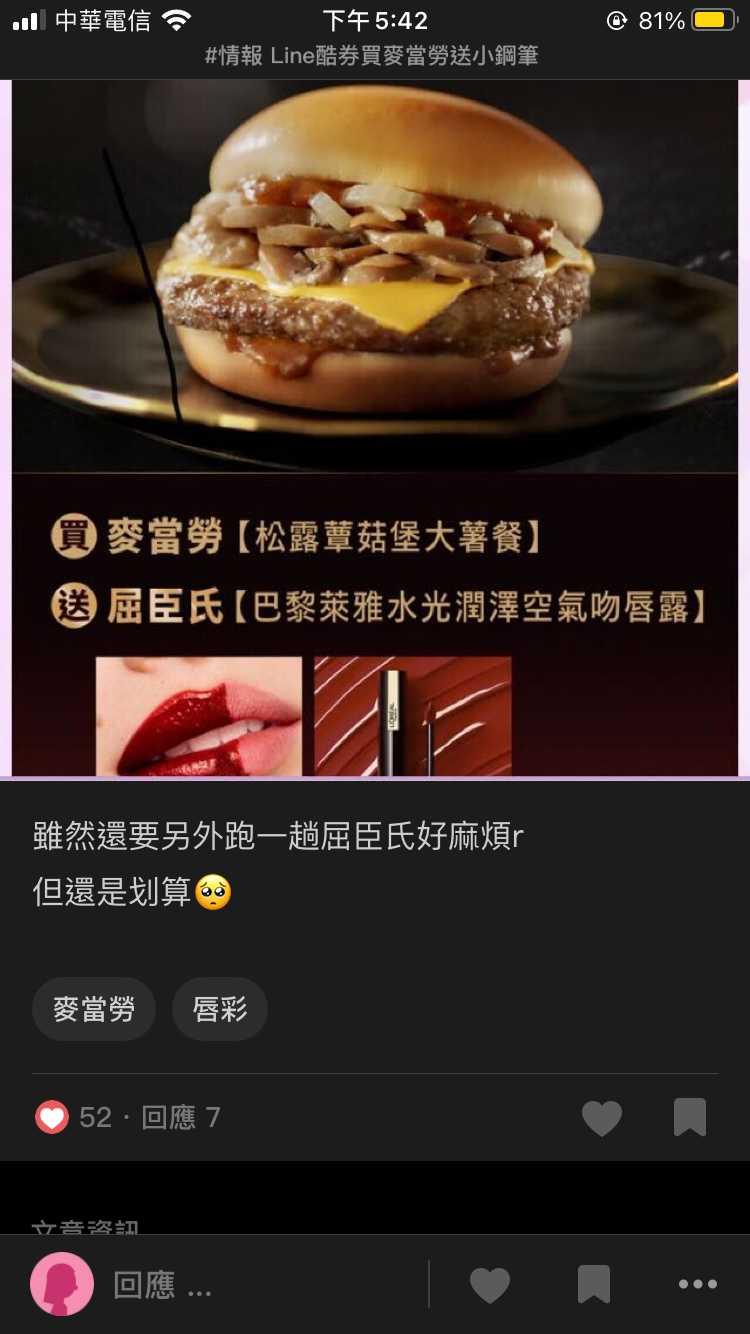 使用【Line酷券】在麥當勞購買【松露蕈菇堡大薯餐】可以去屈臣氏兌換【巴黎萊雅水光潤澤空氣吻唇露】
