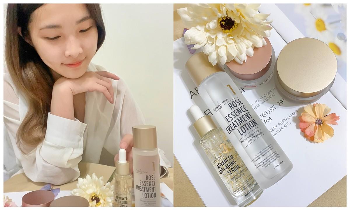 #1玫瑰精萃超導修護露又有小資青春露的美名,質地如同化妝水一樣,很濕潤,膚況吸收效果很好,我也會搭配化妝棉濕敷,敷完後會很明顯可以看到肌膚很有光澤感!我會再輕輕拍加強他的吸收力。