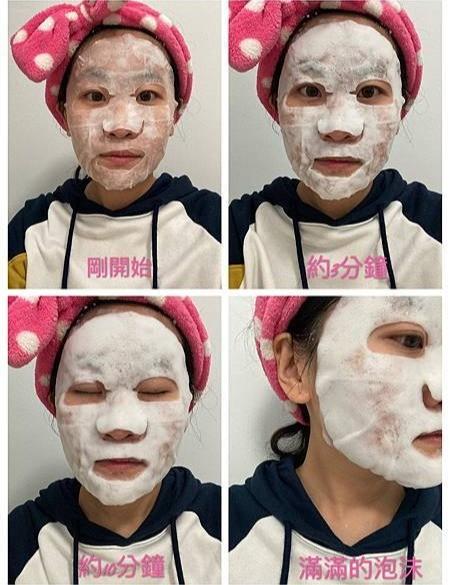一敷上去稍微有點癢的感覺,沒多久面膜就有一堆泡泡出現,敷面膜的時間約5~10分鐘即可。