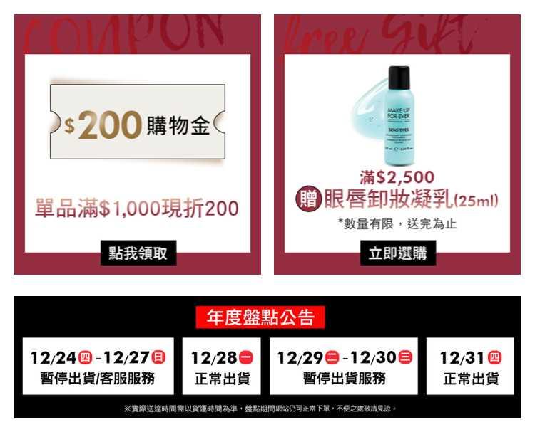 現在滿千折兩百、超商滿1200免運、消費滿2500送眼唇卸妝凝乳25ml