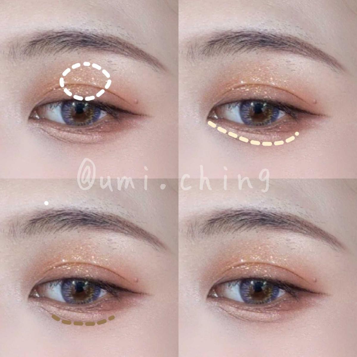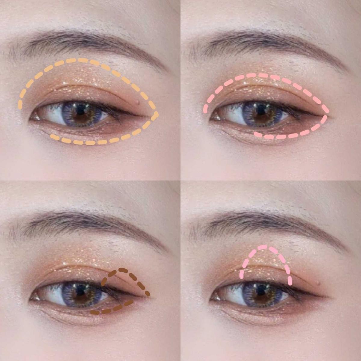左下粉色珠光色打在上眼皮中央(範圍可帶大一點,不要到眼尾棕色部分就好)