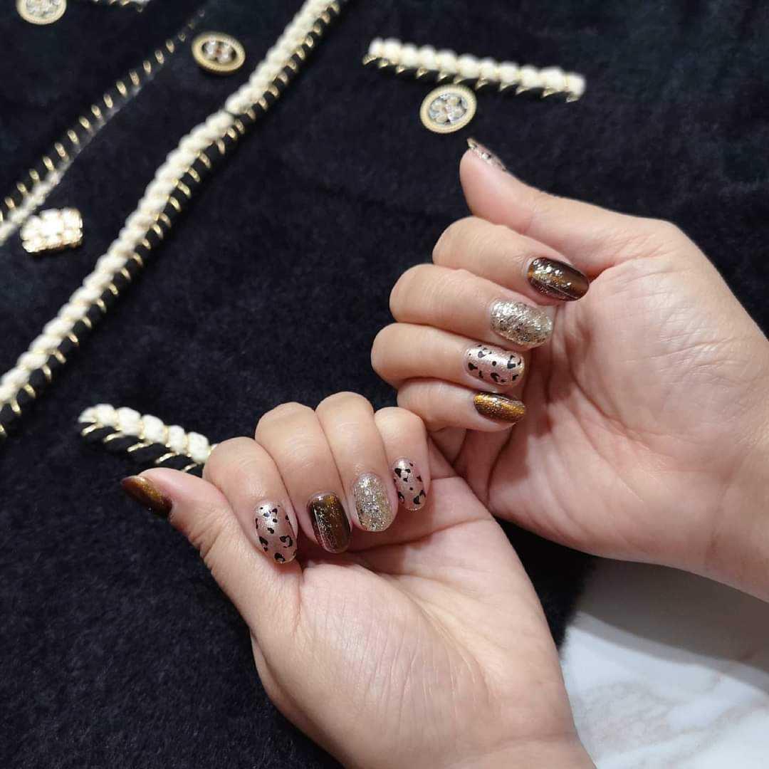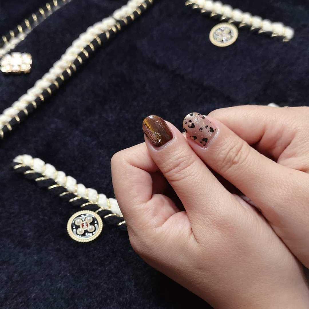 玫瑰金+黑豹紋,指尖還有一抹金。