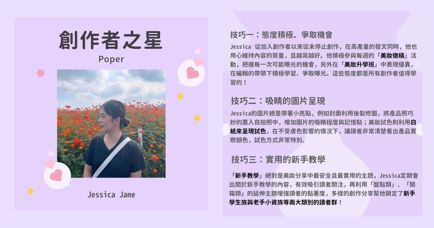 Jessica 從加入創作者以來從未停止創作,在高產量的發文同時,他也用心維持內容的質量,且越寫越好。他積極參與每週的「美妝徵稿」活動,把握每一次可能曝光的機會,另外在「美妝升學班」中表現優異,在編輯的帶領下積極學習、爭取曝光。這些態度都是所有創作者值得學習的。呼籲大家參加最新的「Poper美人關」活動,把握流量、曝光的機會~