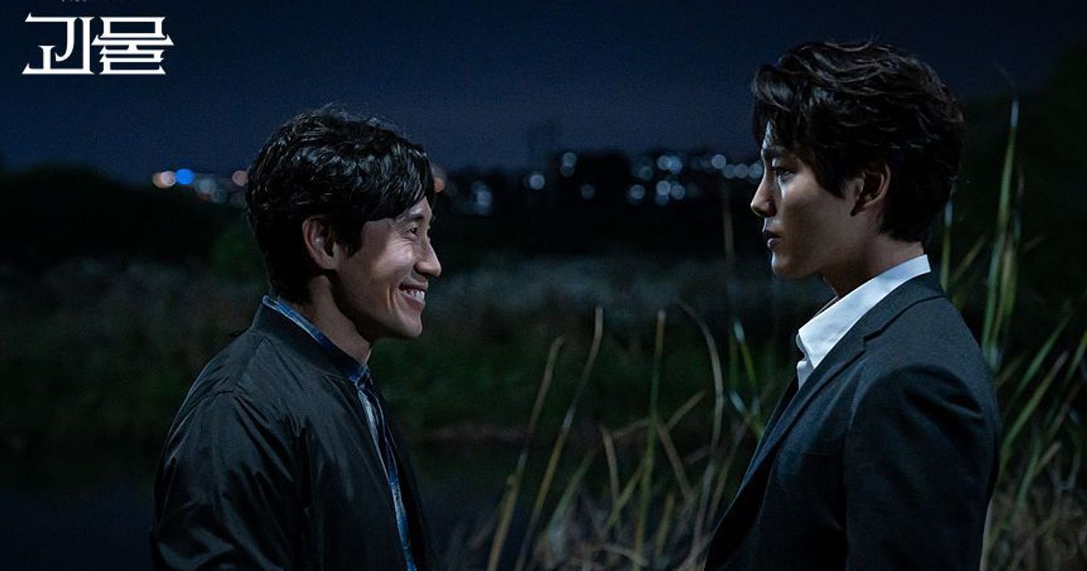 是小宇,上半身赤裸,披頭散髮,兩手拿著刀,不講話,很壓迫的站著。馬路很寂靜,睜著眼睛瞪超大!