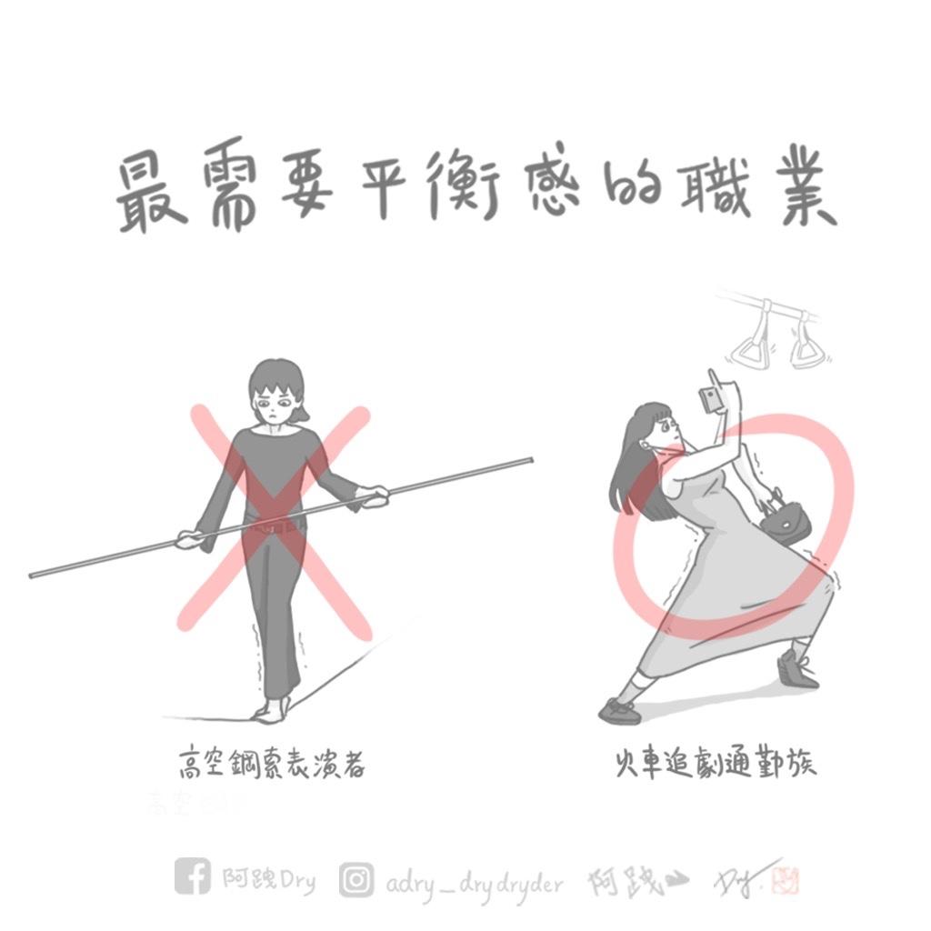- 阿跩是通勤族,每天都要搭90分鐘的車(火車+捷運),常常在車上看到很多神人在車上看手機完全不用抓任何東西,車子晃動的時候也只需要做一些奇怪的姿勢就能達到平衡了。 我也曾經嘗試,但真的好難,看來我的通勤之路還很漫長呢。 https://www.instagram.com/p/CAHBhSOh8Vu/ - #圖文 #插畫 #日常 #梗圖 #通勤 #通勤族 #追劇 #火車追劇 #平衡感 #職業 #特殊技能 #jojo立 #替身攻擊 #殺手皇后 #神人 #阿跩Dry #阿跩圈叉圖